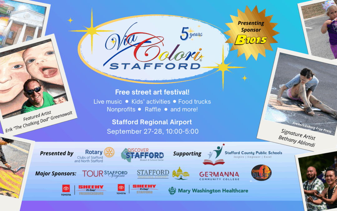 North Stafford Rotary Club and Rotary Club of Stafford are proud to partner with Discover Stafford to host the 5th annual Via Colori® Stafford. Presented by B101.5 and sponsored by Tour Stafford and additional major sponsors, this annual art festival brings dozens of local artists together to transform the streets through large-scale chalk paintings. Internationally known 3D chalk artist Erik Greenawalt, aka The Chalking Dad, is our Featured Artist, and Bethany Ablondi is our Signature Artist will create a special VA250-themed piece featuring the scenic Aquia Landing landscape.