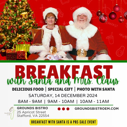 Join us for a delicious breakfast this December! We’re inviting all the kids and their parents to Grounds Bistro’s Annual Breakfast with Mr. & Ms. Claus on Saturday, December 14th; seating times are 8:00 a.m., 9:00 a.m., and 10:00 a.m.